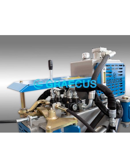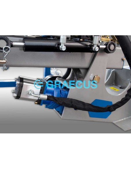 - Η κλίση της κεφαλής ρυθμίζεται υδραυλικά με μοχλό. Άλλος ένα έξτρα απομακρυσμένος μοχλός στη θέση του χειριστή ενεργοποιεί την μετατόπηση για την αποφυγή εμποδίων.