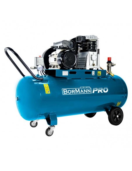 Blank page\n\nΑεροσυμπιεστής της BORMANN PROΑεροσυμπιεστής με ισχυρό κινητήρα αλουμινίου με ιμάντα, με μεγάλο καζάνι\nκαι ικανότητα μεγάλης παροχής αέρα. Με δύο μανόμετρα για ένδειξη πίεσης αέρα\nκαζανιού και εξόδου. Η εργονομική λαβή και σετ τροχών το καθιστούν εύκολο στη\nμεταφορά. Η υδατοπαγίδα εμποδίζει την υγρασία να περάσει στο δίκτυο. Θα καλύψει\nτις ανάγκες των μηχανημάτων αέρος για κάθε απαιτητική εργασία.Δυνατός Κινητήρας Αλουμινίου με Ιμάντα Μεγάλη Ικανότητα Παροχής- Διαθέτει Υδατοπαγίδα- Με Ταχυσύνδεσμο- Ρόδες για Εύκολη Μεταφορά- Διαθέτει Ρυθμιστή Πίεσης