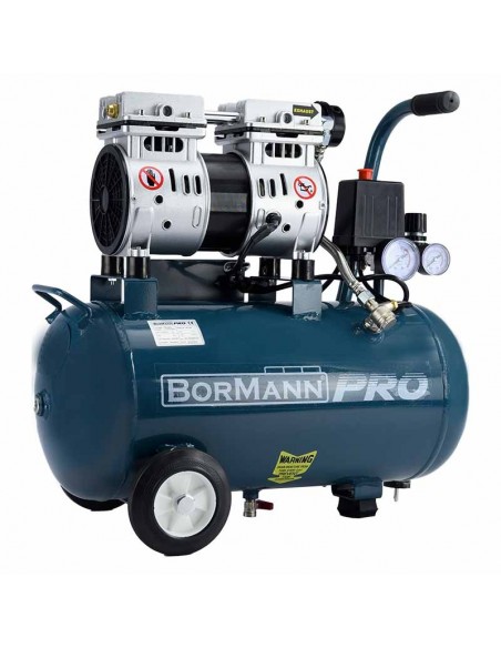 Blank page\n\nΑεροσυμπιεστής της BORMANN PROΑεροσυμπιεστής χαμηλού θορύβου με κινητήρα χωρίς λάδι. Με δύο μανόμετρα για ένδειξη πίεσης αέρα\nκαζανιού και εξόδου. Το ελαφρύ καζάνι του σε συνδυασμό με την εργονομική λαβή\nκαι το σετ τροχών που φέρει, το καθιστούν εύκολο μεταφορά. Δυνατός Κινητήρας Αλουμινίου OIL-LESS Μεγάλη Ικανότητα Παροχής Με Ταχυσύνδεσμο Ρόδες για Εύκολη Μεταφορά Διαθέτει Ρυθμιστή Πίεσης