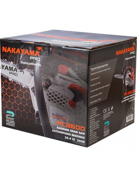 Blank pageΤο PC3600 είναι ένα Κλαδευτικό αλυσοπρίονο βενζίνης της NAKAYAMA PRO. Ελαφρύ και ισχυρό για να δουλεύεται με το ένα χέρι και να επιτυγχάνει\nυψηλής απόδοσης κοπή. Διαθέτει εργονομικό σχήμα και λαβή για να χειρίζεται με άνεση και\nνα φτάνει στα πιο δύσκολα σημεία. Με κινητήρα Euro5 που αποφέρει χαμηλότερη κατανάλωση καυσίμου και\nκαλύτερης ποιότητας καύση, και καθίσταται φιλικό προς το περιβάλλον. Ένας\nπραγματικός σύμμαχος στο κλάδεμα/ κόψιμο.\n\n Κινητήρας δίχρονος 25,4cc Euro5 Ισχύς 1.4hp\n\n Λάμα 25cm 1/4\" Αλυσίδα 1/4\" 1,1mm Βάρος 2,9Kg