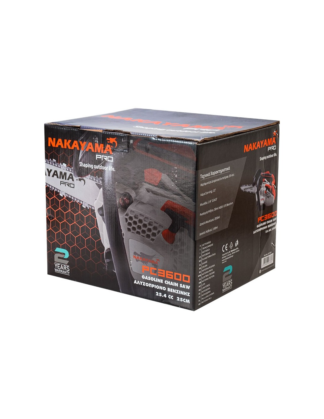 Blank pageΤο PC3600 είναι ένα Κλαδευτικό αλυσοπρίονο βενζίνης της NAKAYAMA PRO. Ελαφρύ και ισχυρό για να δουλεύεται με το ένα χέρι και να επιτυγχάνει\nυψηλής απόδοσης κοπή. Διαθέτει εργονομικό σχήμα και λαβή για να χειρίζεται με άνεση και\nνα φτάνει στα πιο δύσκολα σημεία. Με κινητήρα Euro5 που αποφέρει χαμηλότερη κατανάλωση καυσίμου και\nκαλύτερης ποιότητας καύση, και καθίσταται φιλικό προς το περιβάλλον. Ένας\nπραγματικός σύμμαχος στο κλάδεμα/ κόψιμο.\n\n Κινητήρας δίχρονος 25,4cc Euro5 Ισχύς 1.4hp\n\n Λάμα 25cm 1/4\" Αλυσίδα 1/4\" 1,1mm Βάρος 2,9Kg
