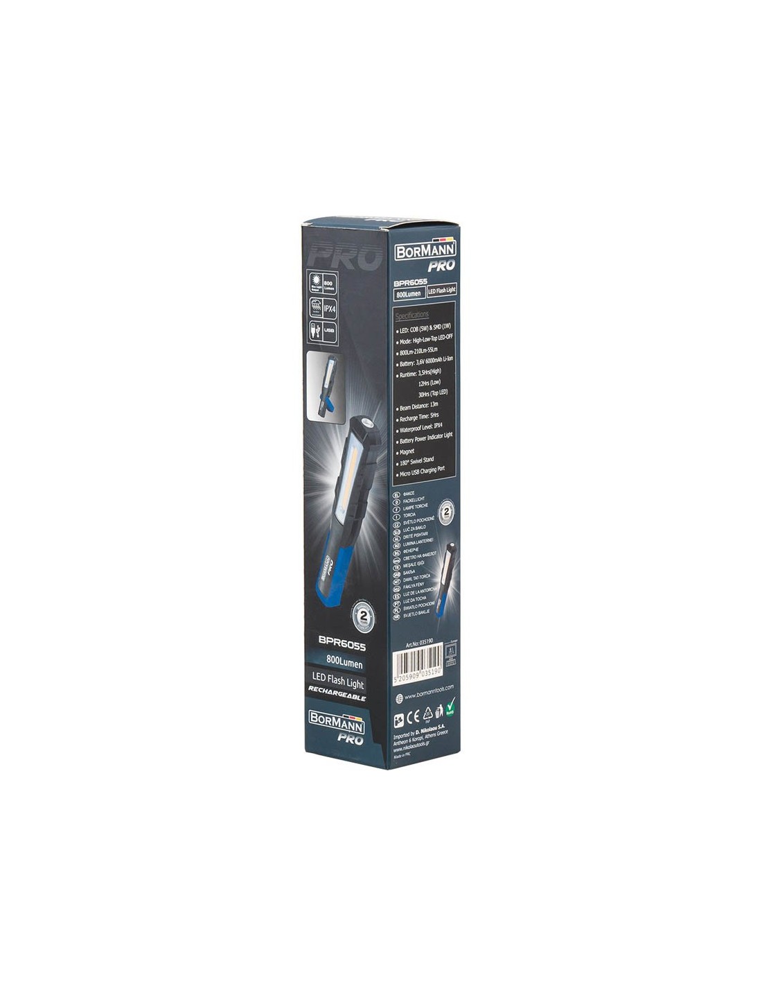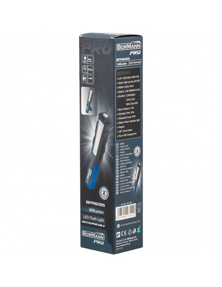 Blank page\n\nΕπαναφορτιζόμενος Φακός LED της BORMANN PROΙσχυρός επαναφορτιζόμενος φακός LED εργασίας με δυνατό μαγνήτη και κινούμενη βάση στήριξης. Στέκεται, αγκιστρώνει και με το εργονομικό σχήμα και κράτημα που έχει διευκολύνει σε δύσκολα σημεία. Με δυνατότητα επιλογής βαθμίδων φωτισμού.\n\n• COB LED • 3 Επίπεδα Φωτεινότητας \n\n• Με Δυνατότητα Εστίασης \n\n• Φόρτιση Μέσω USB \n\n• Χρόνοι Λειτουργίας 3.5 , 12 \nκαι 30 Ωρών\n\nΠεριλαμβάνει : • Καλώδιο ΦόρτισηςΜπαταρία\n 3,6V 6000mAh Li-Ion\n\n