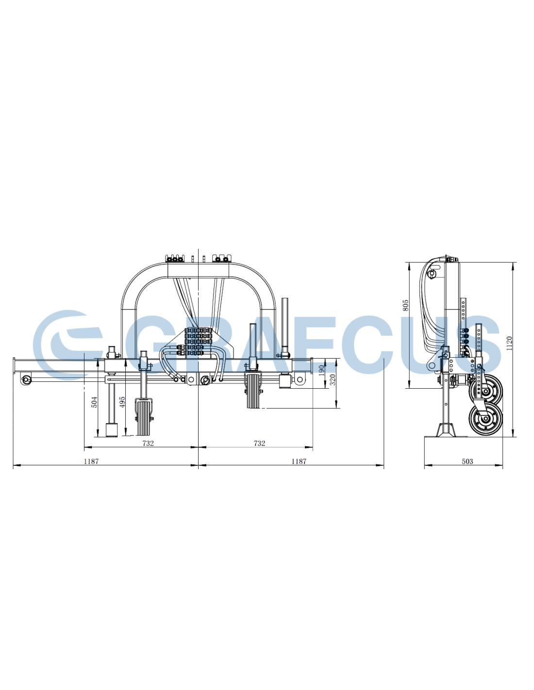 Πλεονεκτήματα και χαρακτηριστικά Βάση με 2 υδραυλικά πτυσσόμενα μπράτσα. Ταχυσύνδεσμοι για την εύκολη προσαρμογή των αξεσουάρ. Προσαρμογή ύψους εργασίας απο τις ρόδες. Βάση στήριξης. Διεθνή ζεύξη τριών σημείων - κατηγορίας II(ø25.0-28.0mm).    Τεχνικά Xαρακτηριστικά Βάρος 134 kg Ίπποι - Πλάτος 1464 mm Μήκος 503 mm Ύψος 1120 mm Μετατόπιση (αριστερά - δεξιά) ← mm 1200/732  ||  732/1200 mm  →