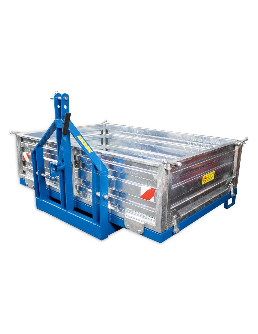 Πλεονεκτήματα και χαρακτηριστικά Μηχανική ανατροπή. 3 αποσπώμενες γαλβανισμένες πλευρές 40 cm για μέγιστη ευελιξία χρήσης. Αρκετά μεγάλο για να χωράει παλέτες. Ιδανικός για αμπελώνες, οπωρώνες και γενική αγροτική χρήση. Ενισχυμένο πάτωμα προσφέρει αντόχη και ανθεκτικότητα. Αντιολισθητικός πείρος εκκένωσης. Ενισχυμένo σε όλα τα σημεία καταπόνησης. Διεθνή ζεύξη τριών σημείων - κατηγορίας I-II(ø 19.0-22.0mm / 25.0-28.0mm). Ευρωπαϊκό πιστοποιητικό ασφαλείας CE.    Τεχνικά Xαρακτηριστικά Βάρος 210 kg Ίπποι 50 - 100 HP Πλάτος 2100 mm Μήκος 1230 mm Ύψος 940 mm Ωφέλιμο φορτίο 900 kg Πλάτος (εσωτερικό) 2000 mm Μήκος (εσωτερικό) 1120 mm Ύψος (εσωτερικό) 460 mm Χωρητικότητα 0,79 m³