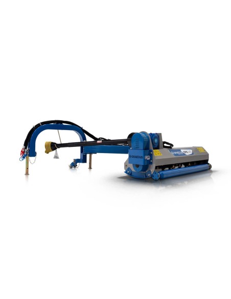 Μηχάνημα επίδειξης, ελαφρά σημάδια χρήσης. Πλήρως λειτουργικό. Ελεγμένο από τεχνικό. Εγγύηση καλής λειτουργίας όπως στο νέο. Οι αισθητικές ατέλειες εξαιρούνται.      Πλεονεκτήματα και χαρακτηριστικά Πλευρικός καταστροφέας. Ειδικής σκλήρυνσης σφυριά 450g, ενδείκνυται για χόρτα και κλαδιά διαμέτρου εως 3εκ. Κιβώτιο μετάδοσης κίνησης (γκρουπ) Τ311 της ιταλικής εταιρίας “COMER”, με καστάνια. Μακράς διάρκειας ζωής ρουλεμάν SKF. Ψηφιακά ζυγισμένο στροφείο με σφυριά ή μαχαίρια. Εμπρόσθια προστατευτικά λαμάκια. Προσαρμογή ύψους εργασίας από τα πέδιλα/γλύστρες. Ρυθμιζόμενο ράουλο στο πίσω μέρος. Μετάδοση κίνησης με οδοντωτούς ιμάντες και εξωτερικό τεντωτήρα. Βάση στήριξης. Διεθνή ζεύξη τριών σημείων κατηγορίας Ι (ø 19.0-22.0mm ). Ευρωπαϊκό πιστοποιητικό ασφαλείας CE. *Στην τιμή συμπεριλαμβάνεται ο άξονας κίνησης (PTO) T4-140 με πλαστικό κάλυμμα.*    Τεχνικά Xαρακτηριστικά Βάρος 318 kg Ίπποι 35 - 55 HP A 760 mm B 1020 mm C 1780 mm D 1300 mm E 2200 mm Πλάτος Εργασίας 1650 mm Σφυριά 28 τεμ. Μαχαίρια (προαιρετικά) 56 τεμ. Στροφείο 108*8 Ιμάντες 4 τεμ.