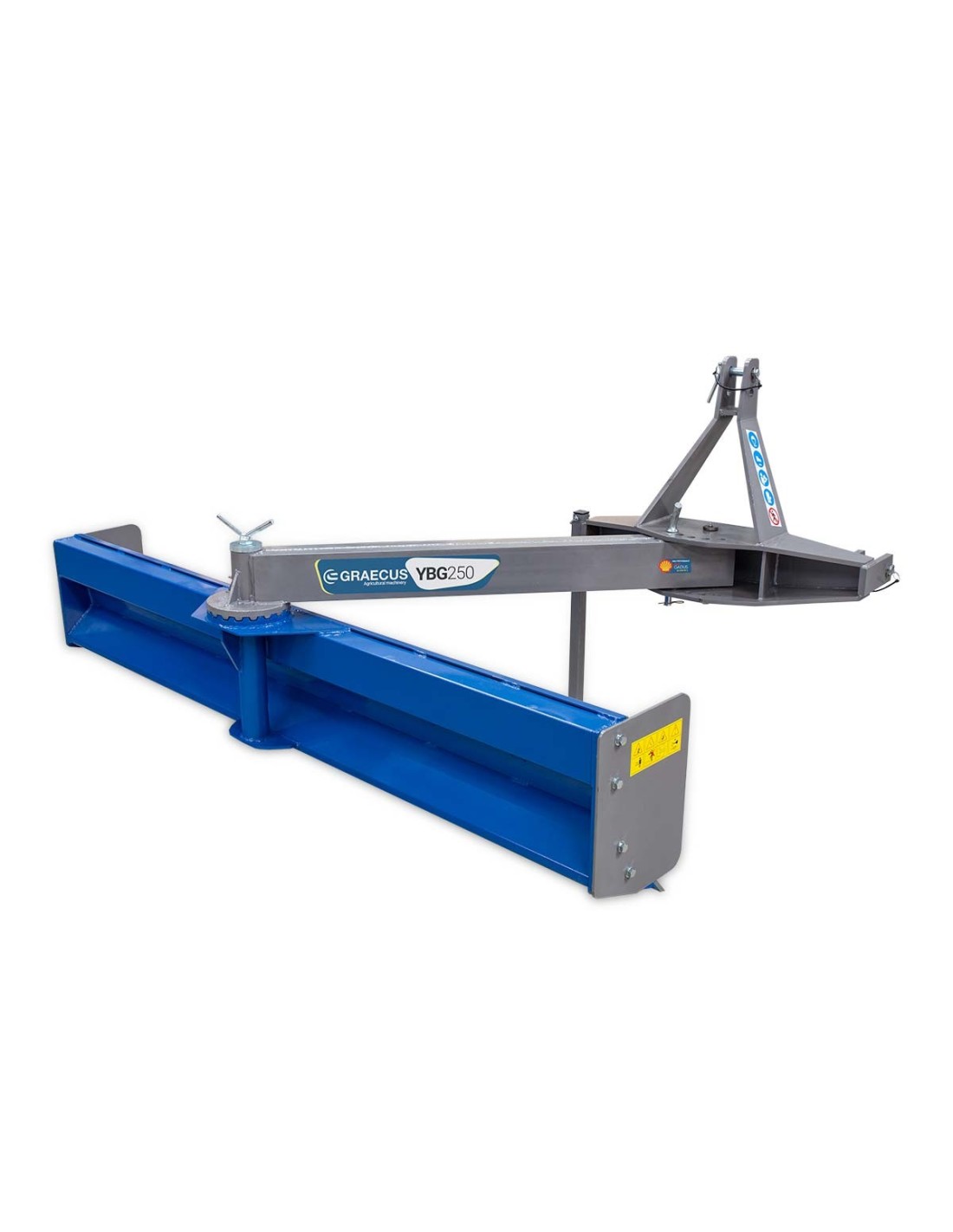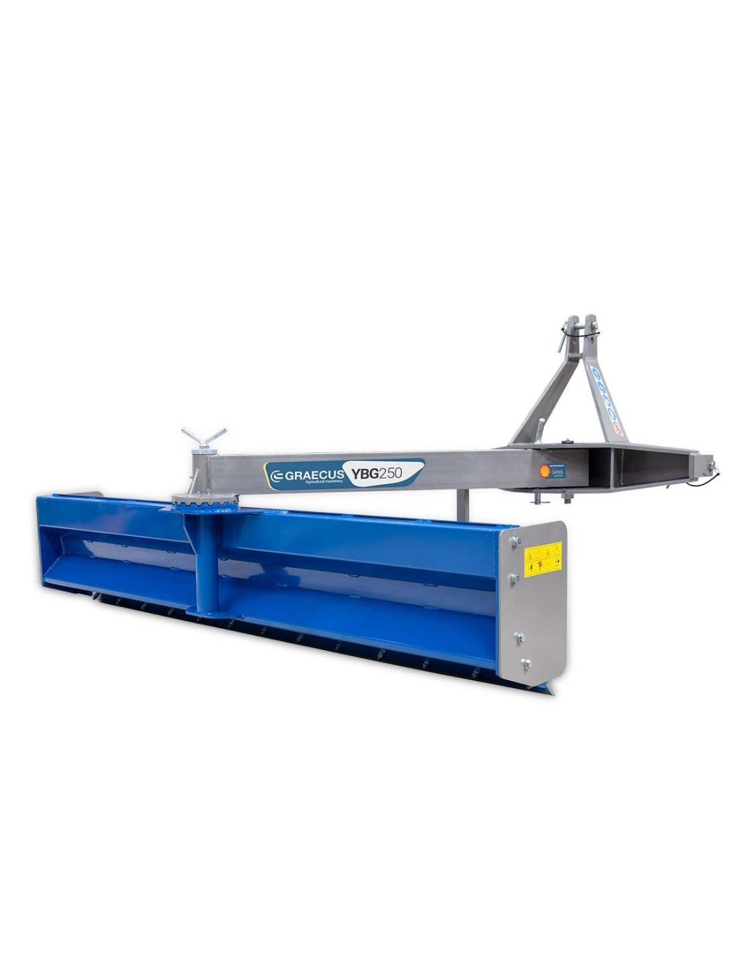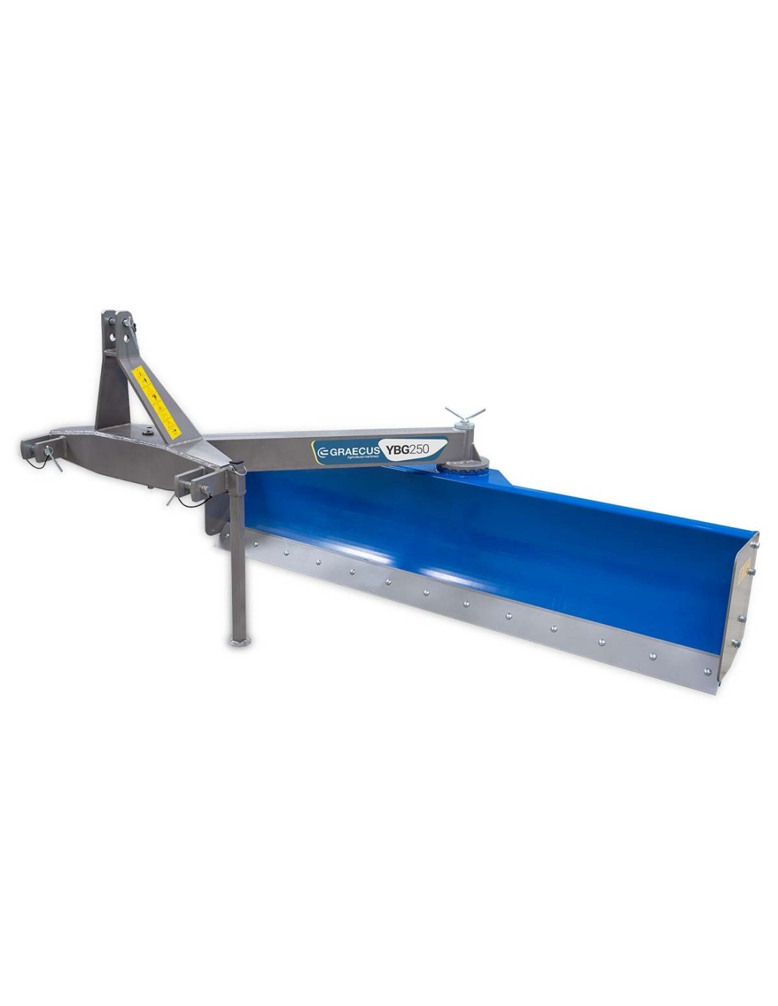 Πλεονεκτήματα και χαρακτηριστικά Περιστρεφόμενη λεπίδα 360º για εμπρόσθια και οπίσθια χρήση. Μύλος για εύκολη περιστροφή, πάνω σε υψηλής αντοχής οδοντωτές πλάκες. Ο βραχίονας μπορεί να μετατοπιστεί έξω από το τρακτερ( αριστερά ή δεξιά), εύκολα και γρήγορα με χρήση πείρου σε πλάκες. Απόσπόμενα πλευρικά προστατευτικά. Κοιλοδοκός ενίσχυσης στη μέση του πίσω μέρους της λεπίδας YBG160 - 200. Διπλή ενίσχυση στο πίσω μέρος του μηχανήματος YBG225 - 250. Μαχαίρι ειδικής σκλήρυνσης. Εναλλάξιμο μαχαίρι. Βάση στήριξης. Διεθνή ζεύξη τριών σημείων – Κατηγορίας I-II(ø 19.0-22.0mm / 25.0-28.0mm). Πιστοποιητικό ασφαλείας CE.    Τεχνικά Xαρακτηριστικά Βάρος 370 kg Ίπποι 60 - 100 HP Πλάτος 2520 mm Μήκος 1770 mm Ύψος 1200 mm Πλάτος εργασίας 2500 mm Ύψος μαχαιριού 550 mm Λάμα 150*15 mm