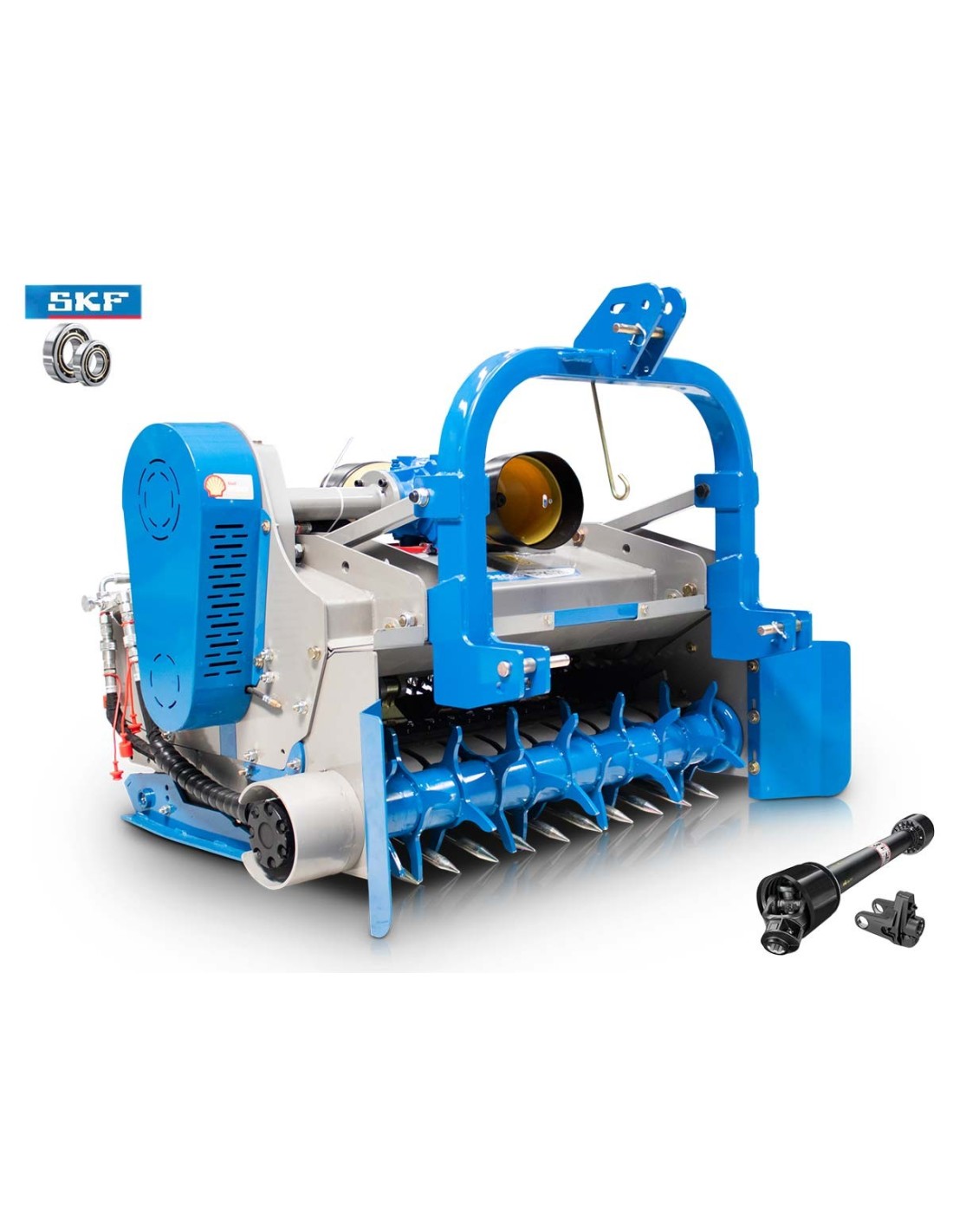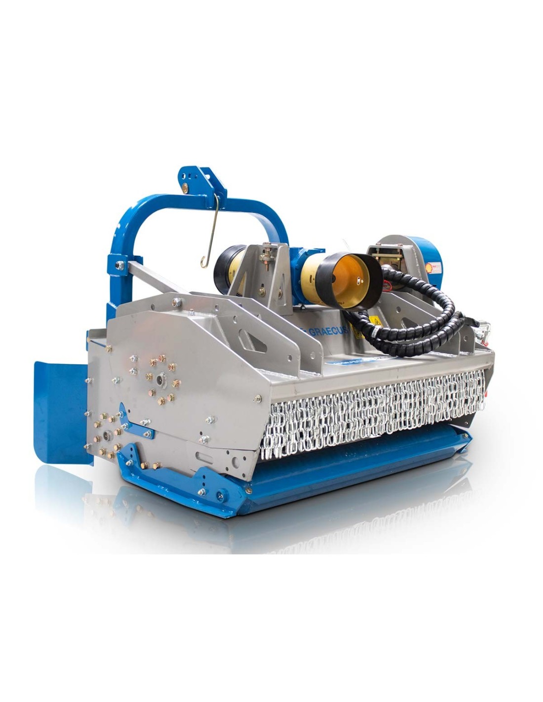 Πλεονεκτήματα και χαρακτηριστικά Μονός προωθητής κλαδιών. Σκάφος 5mm, πλαϊνά 8mm και στροφείο 133x10mm. Διπλής ζεύξης κιβώτιο μετάδοσης κίνησης (γκρουπ) 540 και 1000 r/min. Άθραυστα σφυριά 1400g, ενδείκνυται για διάμετρο κλαδιών εως 7cm. Μακράς διάρκειας ζωής ρουλεμάν SKF. Κόντρες σφυριών στο πάνω και κάτω μέρος του μηχανήματος επιτυγχάνουν τον μέγιστο τεμαχισμό. Ψηφιακά ζυγισμένο στροφείο Προσαρμογή ύψους εργασίας από τα πέδιλα/ γλίστρες. Ρυθμιζόμενο ράουλο στο πίσω μέρος, με ξύστρα. Μετάδοση κίνησης με οδοντωτούς ιμάντες και εξωτερικό τεντωτήρα. Απαιτεί σύνδεση δύο αναμονών σε χειριστήριο ελεύθερης ροής. Διεθνή ζεύξη τριών σημείων κατηγορίας ΙΙ (o 25.0-28.0mm). Ευρωπαϊκό πιστοποιητικό ασφαλείας CE.     *Στην τιμή συμπεριλαμβάνεται ο άξονας κίνησης (PTO) T6-100 με βίδα ασφαλείας.*  Τεχνικά Xαρακτηριστικά Βάρος 892 kg Ίπποι 50 - 100 HP Πλάτος 2050 mm Μήκος 1260 mm Ύψος 1220 mm Πλάτος Εργασίας 1750 mm Μετατόπιση ← mm 875  ||   875 mm  → Σφυριά 18 τεμ. Στροφείο 133*10 mm Ιμάντες 5 Μετάδοση κίνησης προωθητών Καδένα Πάχος κοπής 70 mm