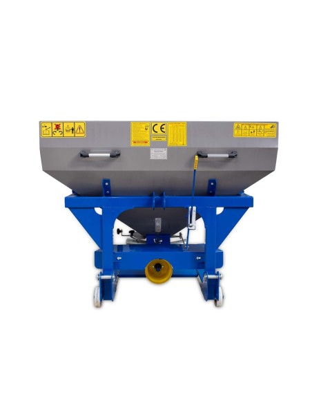 Πλεονεκτήματα και χαρακτηριστικά Κιβώτιο μετάδοσης υψηλών προδιαγραφών 540r/min. Χρήση για εξάπλωση ξηρού, κοκκοποιημένου λιπάσματος και αλατιού. Επίσης μπορεί να χρησιμοποιηθεί για σπορά σιταριού και άλλων σπόρων καθώς και για εκτόξευση αλατιου. Είναι κατασκευασμένο έτσι ώστε να επιτρέπει ομοιόμορφη κατανομή σε όλο το πλάτος. Εξοπλισμένος με οριζόντιο σύστημα μίξερ, το οποίο βοηθάει στην ομαλή ροή λιπάσματος. Εσωτερικός γαλβανιζέ κοχλίας για την καταστροφή σβόλων στη δεξαμενή. Γαλβανιζέ δίσκοι με 6 πτερύγια και πόρτες εξαγωγής υλικού. Μηχανικός ή υδραυλικός έλεγχος των θυρίδων. Διεθνή ζεύξη τριών σημείων. Ευρωπαϊκό πιστοποιητικό ασφαλείας CE. *Στην τιμή συμπεριλαμβάνεται ο άξονας κίνησης (PTO) T2-80 με πλαστικό κάλυμμα.* Τεχνικά Xαρακτηριστικά Βάρος 142 kg Ίπποι 40 HP Πλάτος 1500 mm Μήκος 1150 mm Ύψος 1250 mm Χωρητικότητα 800 λίτρα Απόσταση διανομής 18 - 20 m Δίσκοι 1