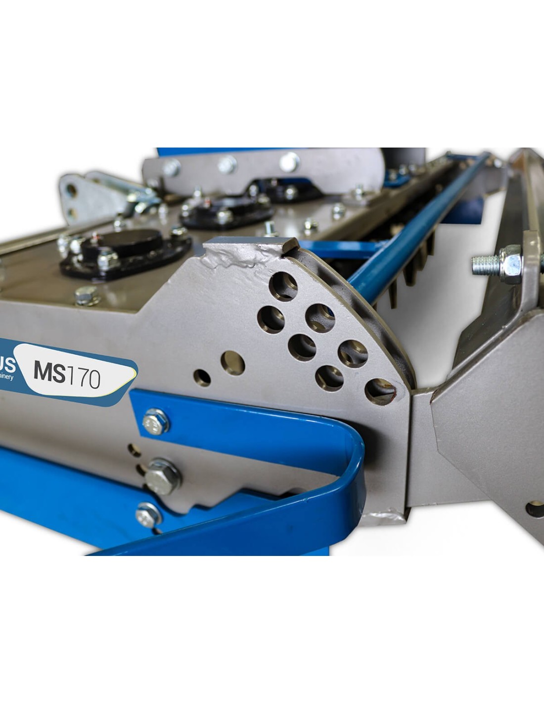 Πλεονεκτήματα και χαρακτηριστικά Μαντεμένιο κιβώτιο μετάδοσης μιας ταχύτητας ( group) 540r/min. Σύστημα μετάδοσης κίνησης με γρανάζια σε λουτρο λαδιού. Μακράς διάρκειας ζωής ρουλεμάν. Ρυθμιζόμενο ράουλο στο πίσω μέρος, δίνει το μέγιστο αποτέλεσμα. Κυκλική κίνηση των μαχαιρίων. Προσαρμογή βάθους εργασίας από τα πέδιλα/γλύστρες. Ειδικής σκλήρυνσης μαχαίρια. Διεθνή ζεύξη τριών σημείων - κατηγορίας I-II (ø 19.0-22.0mm / 25.0-28.0mm). Ευρωπαϊκό πιστοποιητικό ασφαλείας CE.   *Στην τιμή συμπεριλαμβάνεται ο άξονας κίνησης (PTO) T5-80 με βίδα ασφαλείας.*    Τεχνικά Xαρακτηριστικά Βάρος 346 kg Ίπποι 35 - 70 HP Πλάτος 2080(1700) mm Μήκος 1230 mm Ύψος 920 mm Πλάτος εργασίας 1700 mm Μετατόπιση 700  ||  1000 Μαχαίρια 8 + 8 τεμ. Σειρές Μαχαιριών 8 Βάθος εργασίας 200 mm Διάμετρος ανέμης 305 mm