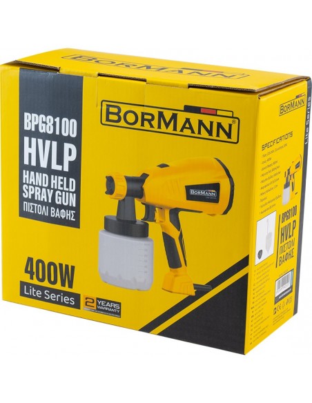 Blank pageΠιστόλι βαφής ηλεκτρικό HVLP 400W, 800mlΠρακτικός και ευέλικτος τρόπος για εργασίες βαφής σε εσωτερικούς και εξωτερικούς χώρους. Ενσωματώνουν την τεχνολογία HVLP που εξασφαλίζει τέλεια βεντάλια ψεκασμού πλήρως ρυθμιζόμενη χωρίς τη δημιουργία ενοχλητικής νέφωσης χρώματος. Χαρίζει άριστο τελικό αισθητικό αποτέλεσμα, οικονομία και ταχύτητα, πλεονεκτήματα ασύγκριτα καλύτερα από τη βαφή με πινέλα, ρολά κλπ.Μπορείτε να χρησιμοποιήσετε μεγάλη γκάμα υλικών (όπως βερνίκια και χρώματα υδατοδιαλυτά) και να καλύψετε ένα μεγάλο εύρος αναγκών. Η βεντάλια μπορεί να ρυθμιστεί ώστε να ψεκάζει οριζόντια, κάθετα ή σε λεπτή στρογγυλή δέσμη για εύκολη πρόσβαση στα δύσκολα σημεία. Διαθέτουν ρυθμιστή ποσότητας χρώματος για ακόμη καλύτερη προσαρμογή και ευελιξία ανάλογα με το υλικό και τη χρήση. Επίσης έχουν αποσπώμενη κεφαλή που καθιστά πανεύκολο τον καθαρισμό τους. Περιλαμβανει Ακροφυσιο: Φ1.8/2.6mm Κυπελλο Μετρησης Ιξωδους