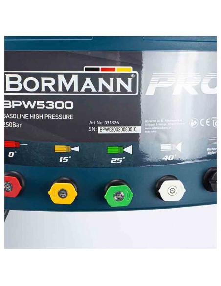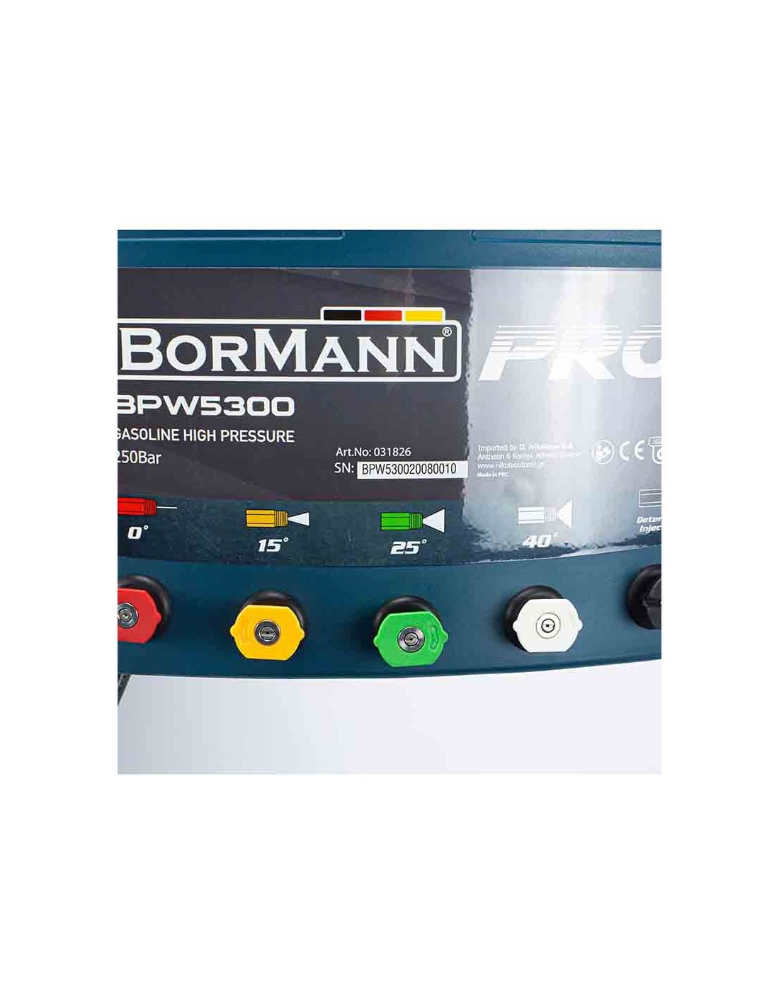 Blank page\n\n\n\nΒενζινοκίνητο Πλυστικό της BORMANN PROΤροχήλατο βενζινοκίνητο μηχάνημα υψηλής πίεσης για να αντιμετωπίσει μεγάλο\nεύρος εργασιών καθαρισμού: σπίτια, κτίρια, αυτοκίνητα, φορτηγά, σκάφη,\nκαταστρώματα, δρόμους, αίθρια, κήπους κ.α. Αλουμινένια κατασκευή με μαντεμένια\nτριεμβολική αντλία υψηλής ισχύος. Εξοπλισμένο με δοχείο απορρυπαντικού για\nαπομάκρυνση της σκληρής βρωμιάς. Με βάση και ρόδες που προσφέρουν εύκολη\nμετακίνηση σε δυσπρόσιτους χώρους. •Ιδανικό Για Τον Καθαρισμό Ακόμη\nΚαι Της Πιο Σκληρής Βρωμιάς• Κινητήρας Βενζίνης Τελευταίας\nΤεχνολογίας Για Μεγαλύτερη Ισχύ Και Αξιοπιστία• Ενσωματωμένο Δοχείο\nΑπορρυπαντικού• Λειτουργία Χαμηλού Θορύβου• Τροχοφόρο, Με Εύκαμπτο Σωλήνα 5\nΜέτρων, Για Εύκολη Μεταφορά• Ειδικός Σχεδιασμός Για Αποθήκευση\nτων Ακροφυσίων Και του Πιστόλιου Επάνω Στο Σώμα• Επαγγελματικά Ακροφύσια\nΓρήγορης Εναλλαγής