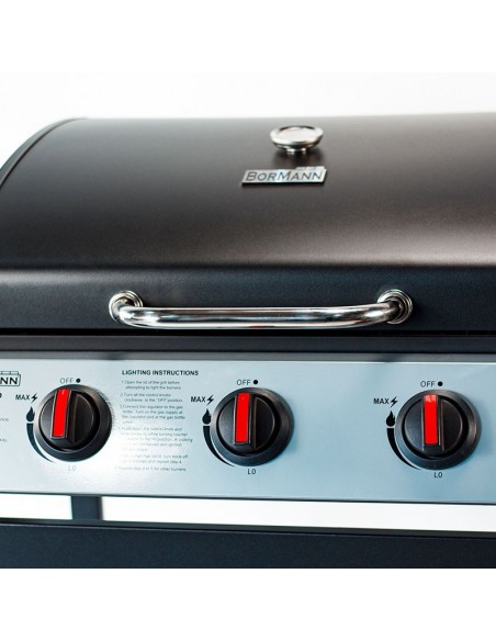 Blank pageΨησταριά Υγραερίου ELEMENT, 3 εστιών απο την BORMANN, με μαντεμένια σχάρα, ρόδες\nγια εύκολη μεταφορά και μεγάλο θερμόμετρο στο καπάκι. Επίσης διαθέτει 2 ράφια στις\nπλευρές και πιεζοηλεκτρικό άναμμα εστιών.\n\n*Δεν συμπεριλαμβάνονται ο ρυθμιστής πίεσης και η σωλήνα.\n\n3 Εστιών με Μαντεμένια Σχάρα Με Ρόδες για Ευκολη ΜεταφοράΜεγάλο Θερμόμετρο στο Καπάκι Δύο Ράφια στις ΠλευρέςΠιεζοηλεκτρικό Άναμμα ΕστιώνΔιαστάσεις Ψησίματος 600x450mmΔεν περιλαμβάνει Ρυθμιστή Πίεσης και Σωλήνα